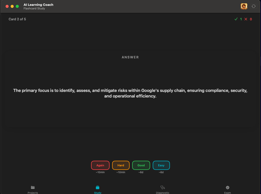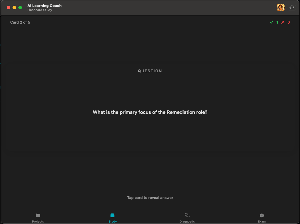 For each milestone, the OptimizerAgent acts as a content creator. It generates high-quality flashcards tailored to the specific concepts of that stage. The iOS app implements a native Spaced Repetition System (SM-2), allowing the user to study efficiently, flipping cards to test their Active Recall.
