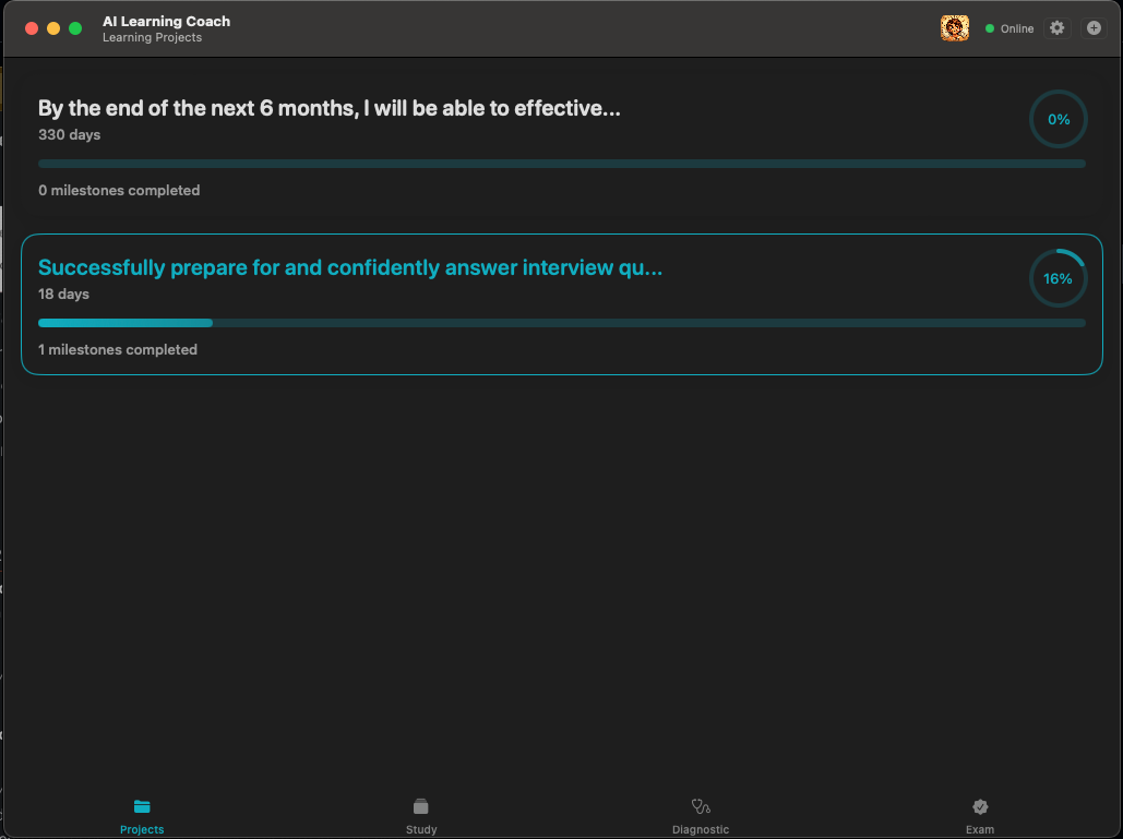 The journey begins on the Home View. Here, the user can manage their portfolio of learning topics. The app persists state locally and syncs with the server, so progress is never lost.